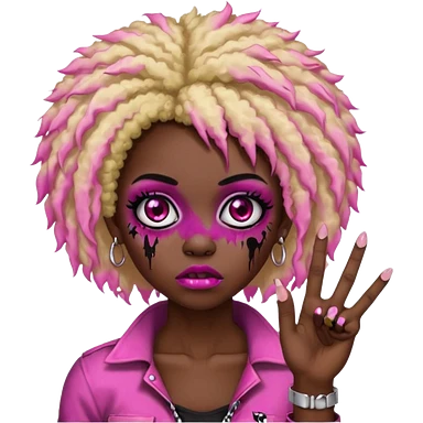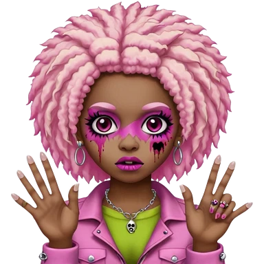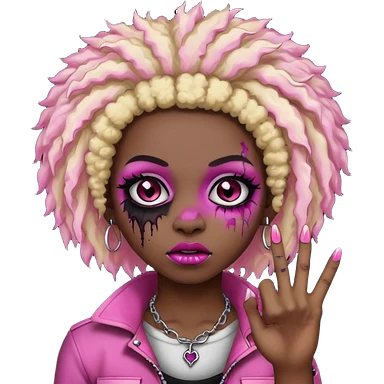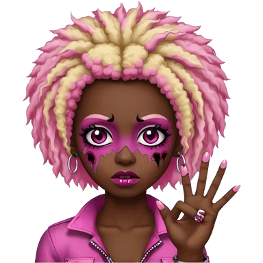 girl, zombie,pink and blonde afro, medium long, emo, shaggy, dark, spooky,double eyebrow dermal piercing, two fingers up emoji