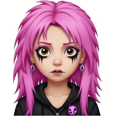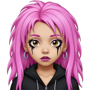 girl,darksinvampire, pink hair, very longhair , shaggy, dark, spooky,double eyebrow dermal piercing, creepy expression emoji