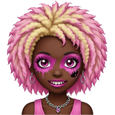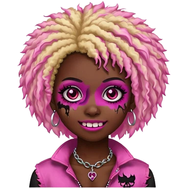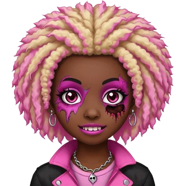 girl, zombie,pink and blonde afro, medium long, emo, shaggy, dark, spooky,double eyebrow dermal piercing, cute illuminous smile emoji