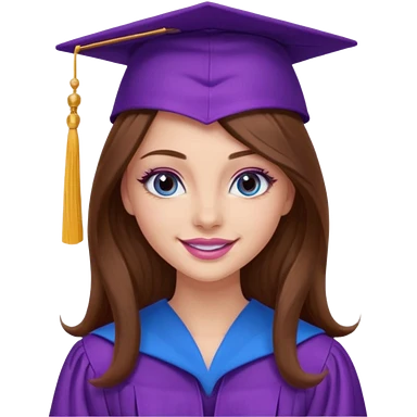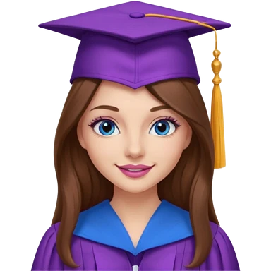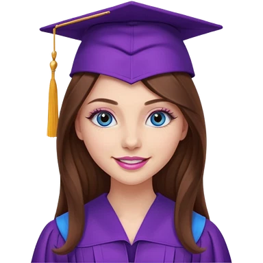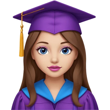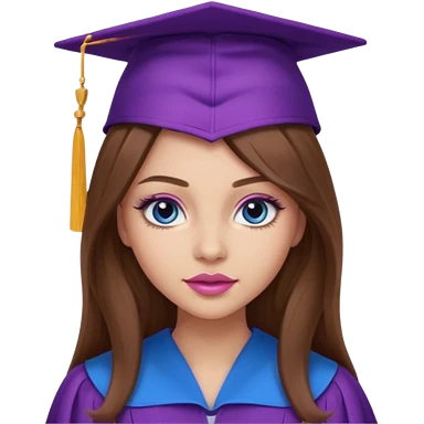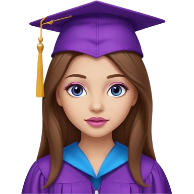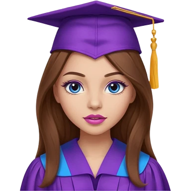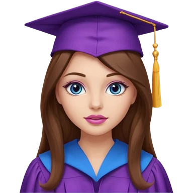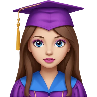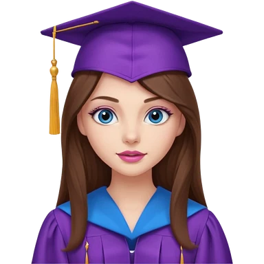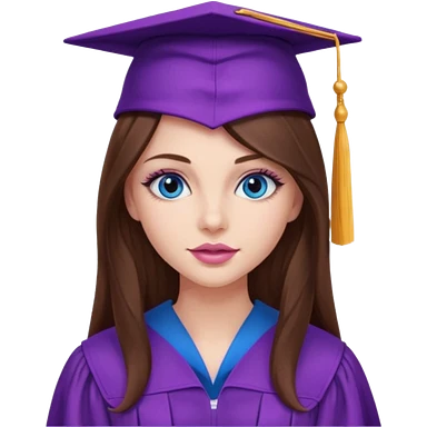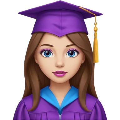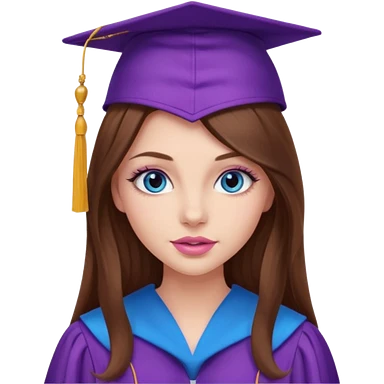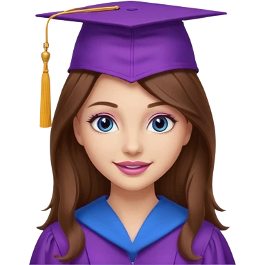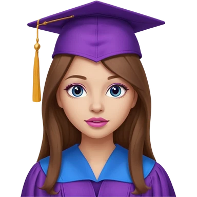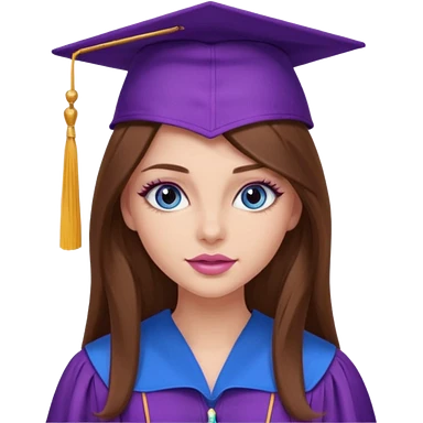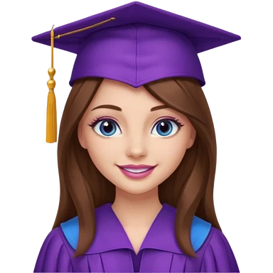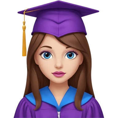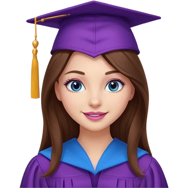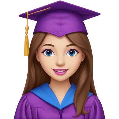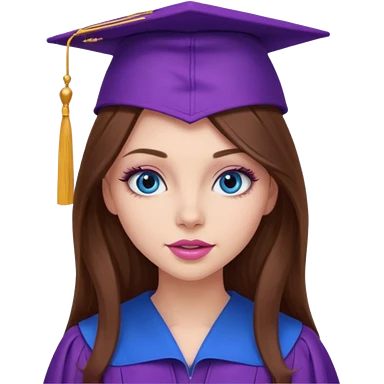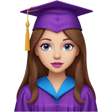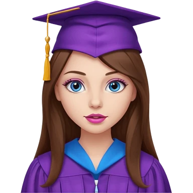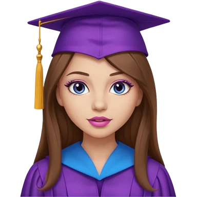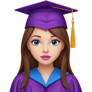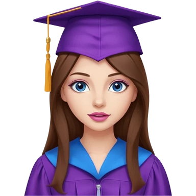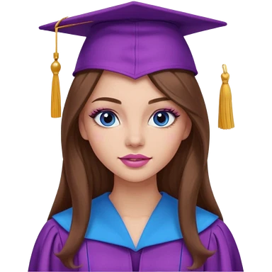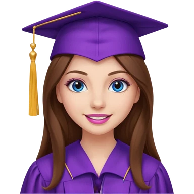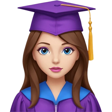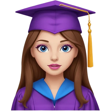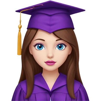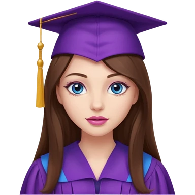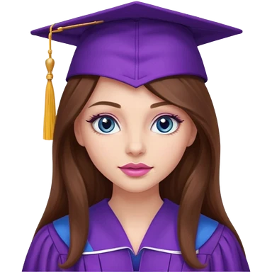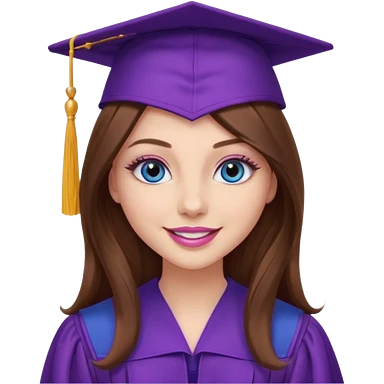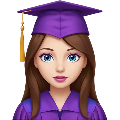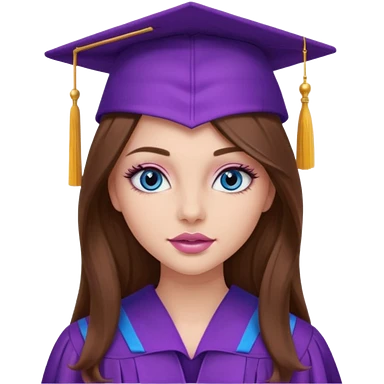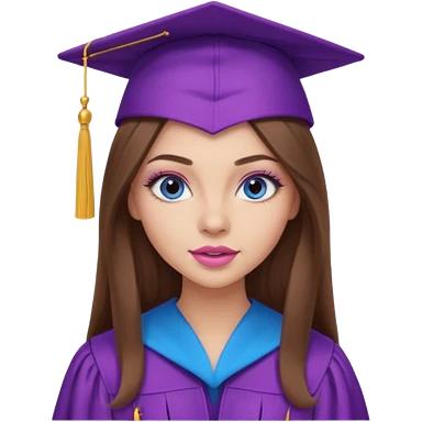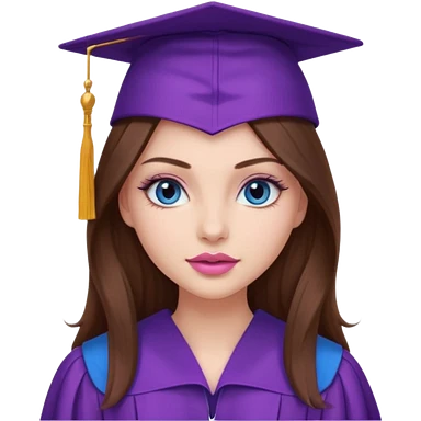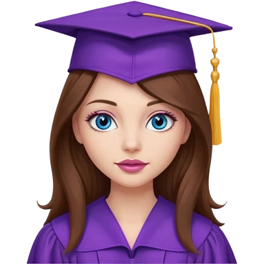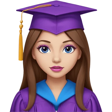 girl with gorgeous long brown hair, blue eyes, long lashes makeup, sexy pink lips, wearing a purple graduation cap and gown emoji