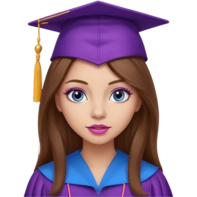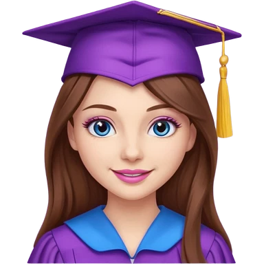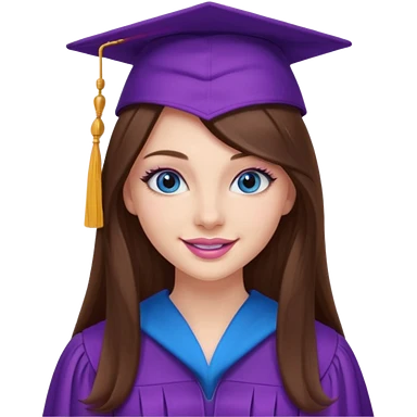 girl with beautiful extremely long brown hair, blue eyes, long lashes makeup, sexy pink lips, wearing a purple graduation cap and gown emoji