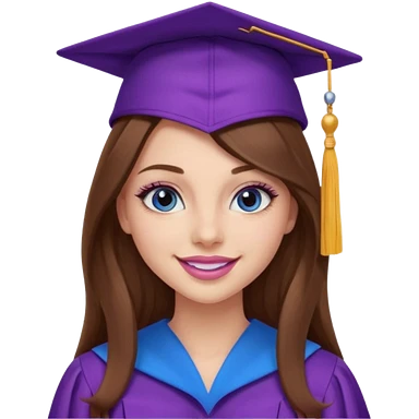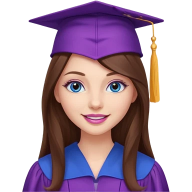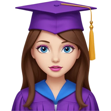 girl with gorgeous long brown hair, blue eyes, long lashes makeup, sexy pink lips, wearing a purple and pink graduation cap and gown emoji