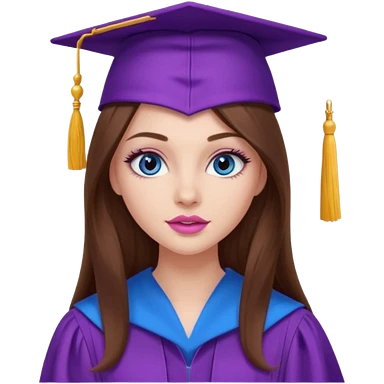 girl with beautiful long brown hair, blue eyes, long lashes makeup, sexy pink lips, wearing a purple graduation cap and gown emoji