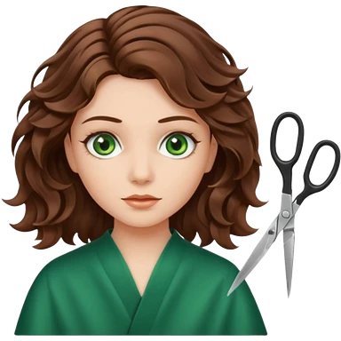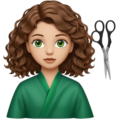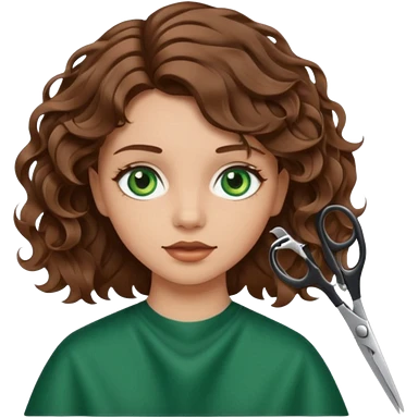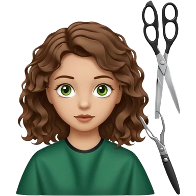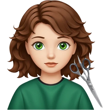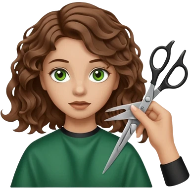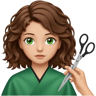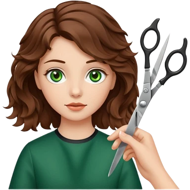 Girl with green eyes and brown wavy hair getting haircut with scissors emoji