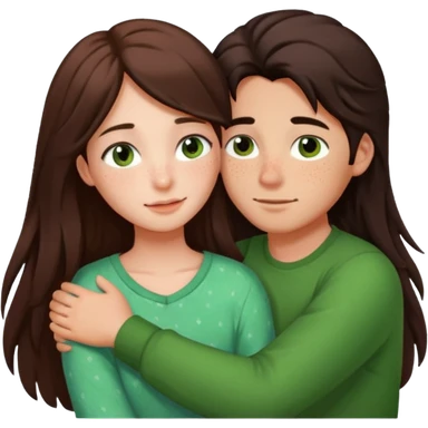Girl and boy couple Both peach skin and darkish brown hair, give girl freckles HUGgING EMOJI, and give only the girl long hair and green brown eyes too emoji