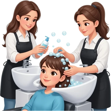 Girl at a hair salon getting her hair washed at the sink, hairdresser gently washing her hair with shampoo, lots of soap bubbles, relaxing salon atmosphere, modern salon chairs and mirrors, soft lighting, clean and aesthetic, realistic style emoji