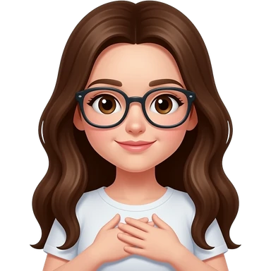 Girl with long brown hair wearing glasses and dark brown eyes with hands on chest emoji