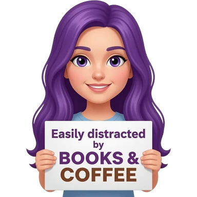 girl with long purple hair with a Easily distracted by BOOKS & COFFEE sign emoji