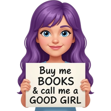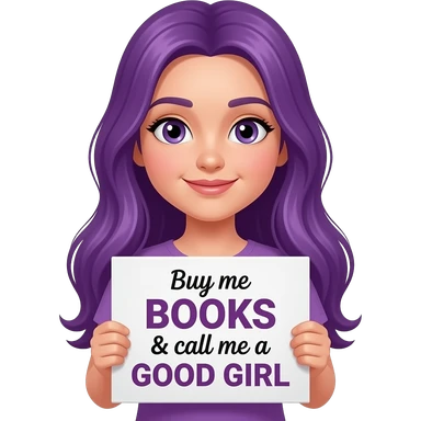girl with long purple hair with a Buy me BOOKS & call me a GOOD GIRL sign emoji