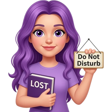 girl with long purple hair with a LOST in a BOOK... please do not ISTURB sign emoji