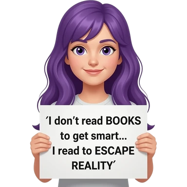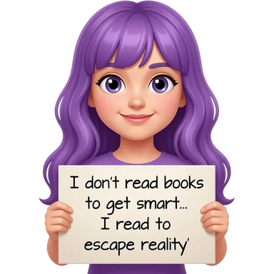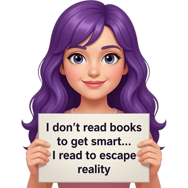 girl with long purple hair with a I don't read BOOKS to get smart... I read to ESCAPE REALITY sign emoji