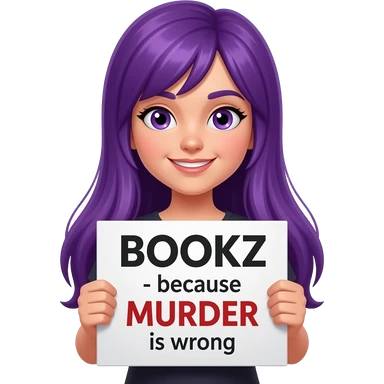 girl with long purple hair with a BOOKZ... because MURDER is wrong sign emoji