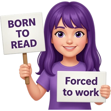 girl with long purple hair with a BORN TO READ Forced to work sign emoji