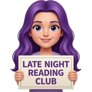 girl with long purple hair with a LATE NIGHT READING CLUB sign emoji