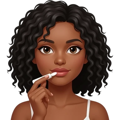 Medium dark skinned woman with black curly shoulder-length hair applying cream to her upper lip region. emoji