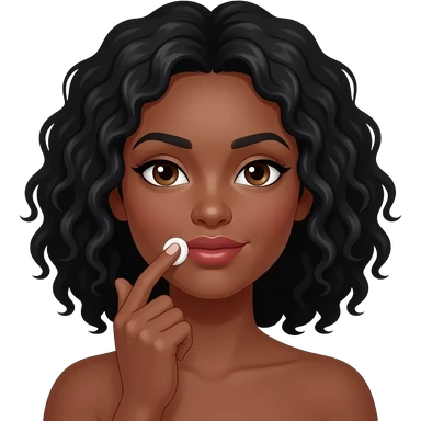 Medium dark skinned woman with black curly shoulder-length hair applying cream to her upper lip area. emoji
