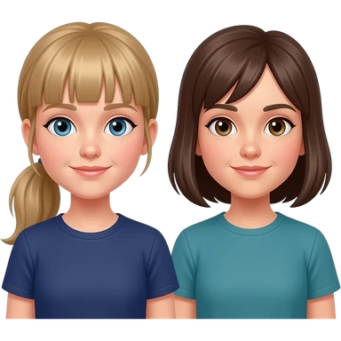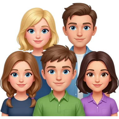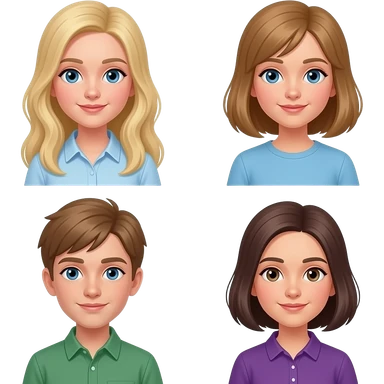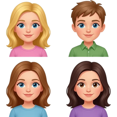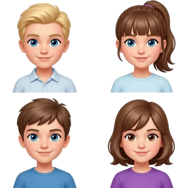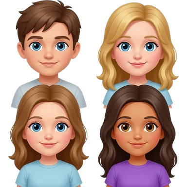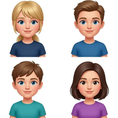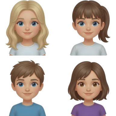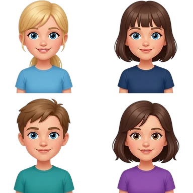 girl blonde hair and blue eyes, girl with light brown hair in ponytail with bangs and blue eyes, boy with light brown shorthair and blue eyes and green tshirt, girl dark brown shoulder length hair and brown eyes and a purple tshirt emoji | AI Emoji Generator