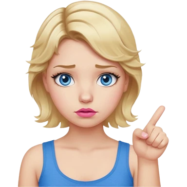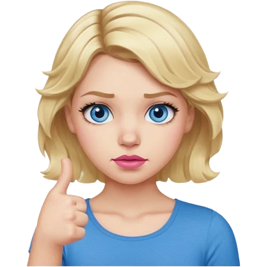 Girl Blonde short wavy hair, blue eyes, cute blue top, long lashes, pink lips, showing thumbs down 👎 emoji | AI Emoji Generator