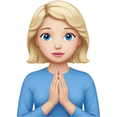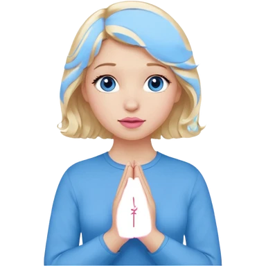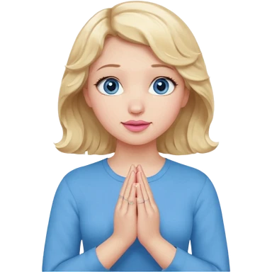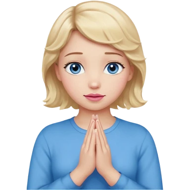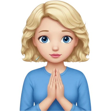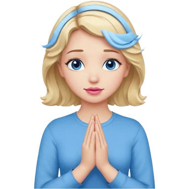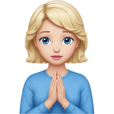 Girl Blonde short wavy hair, blue eyes, cute blue top, long lashes, pink lips, praying hands emoji