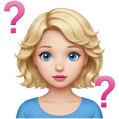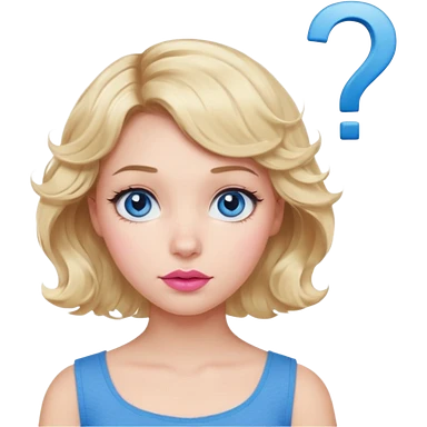 Girl Blonde short wavy hair, blue eyes, cute blue top, long lashes, pink lips, question mark emoji