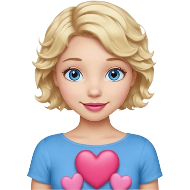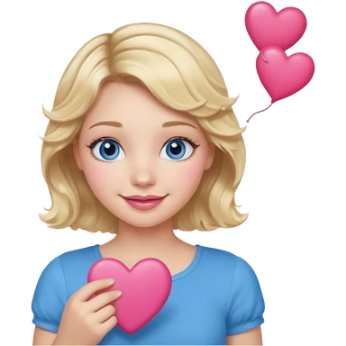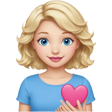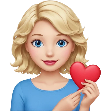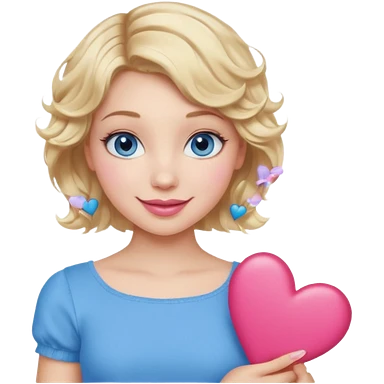 Girl Blonde short wavy hair, blue eyes, cute blue top, long lashes, pink lips, smiling, holding hearts emoji