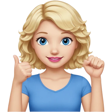 Girl Blonde short wavy hair, blue eyes, cute blue top, long lashes, pink lips, smiling, 👍🏻 emoji