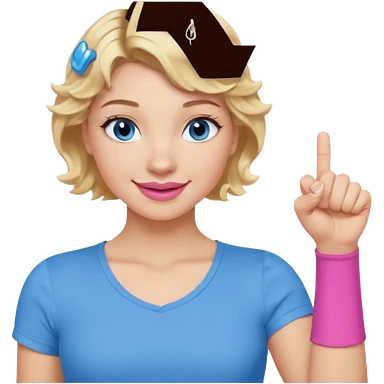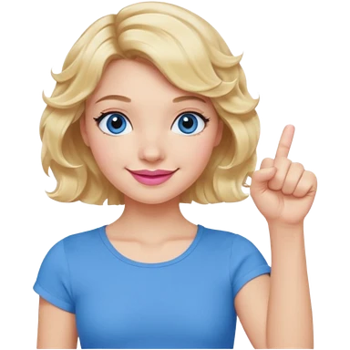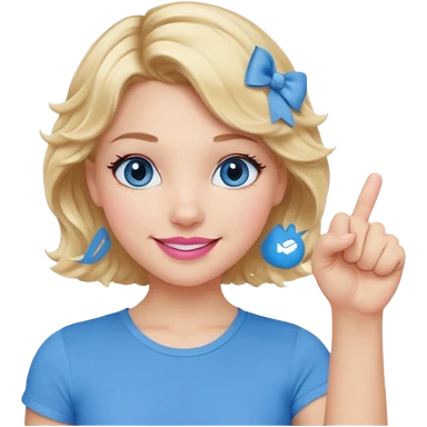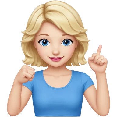 Girl Blonde short wavy hair, blue eyes, cute blue top, long lashes, pink lips, smiling, fist bump emoji
