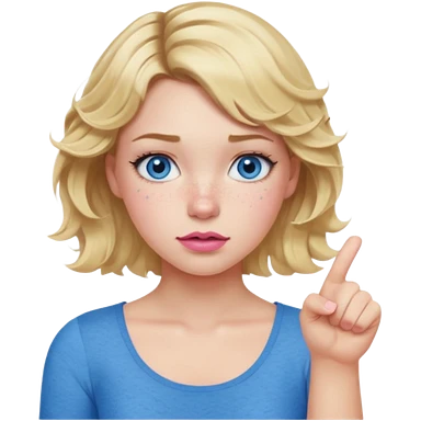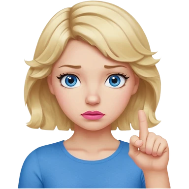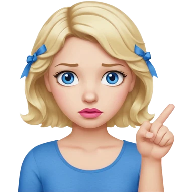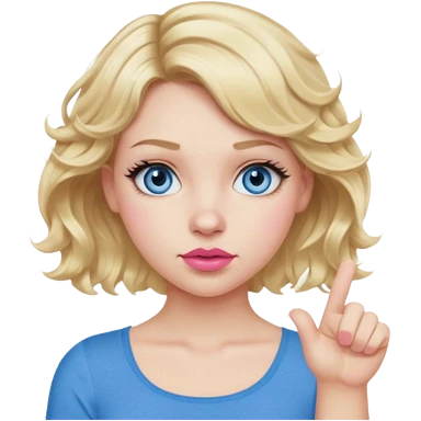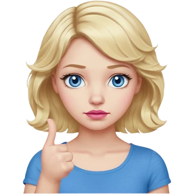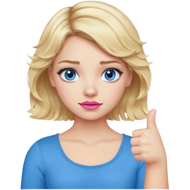Girl Blonde short wavy hair, blue eyes, cute blue top, long lashes, pink lips, thumbs down emoji
