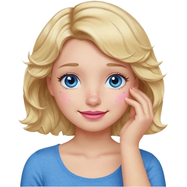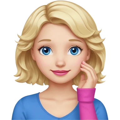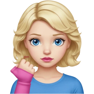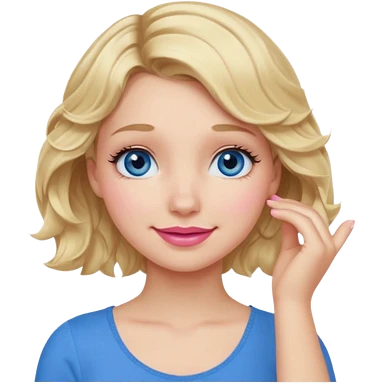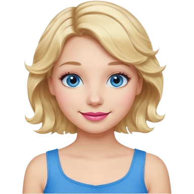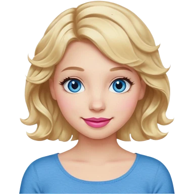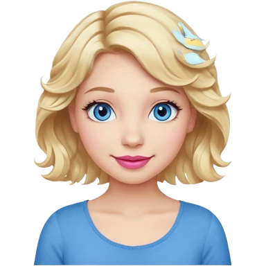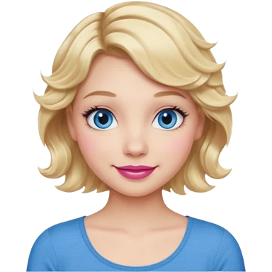 Girl Blonde short wavy hair, blue eyes, cute blue top, long lashes, pink lips, emoji