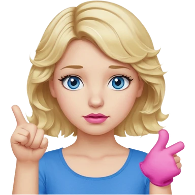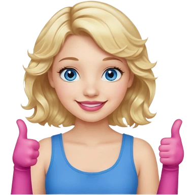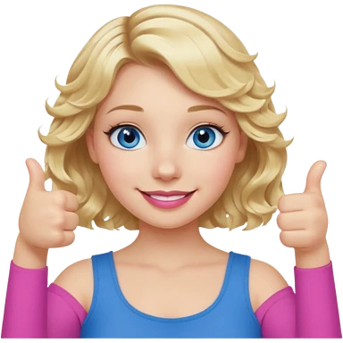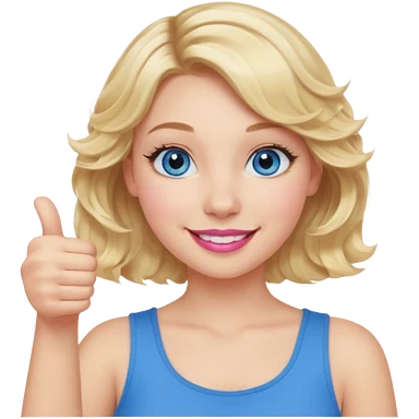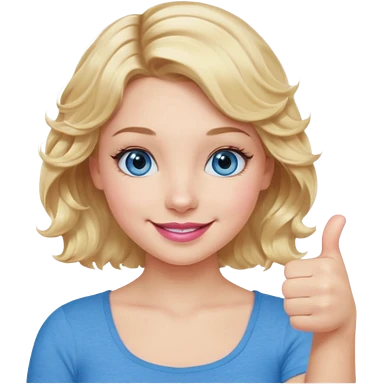 Girl Blonde short wavy hair, blue eyes, cute blue top, long lashes, pink lips, smiling, thumbs up emoji | AI Emoji Generator