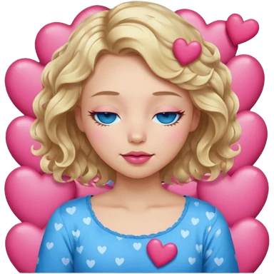 Girl Blonde short wavy hair, blue eyes, cute blue top, long lashes, pink lips, sleeping eyes closed, hearts floating emoji