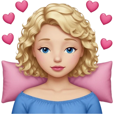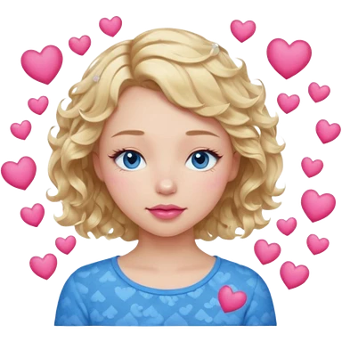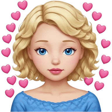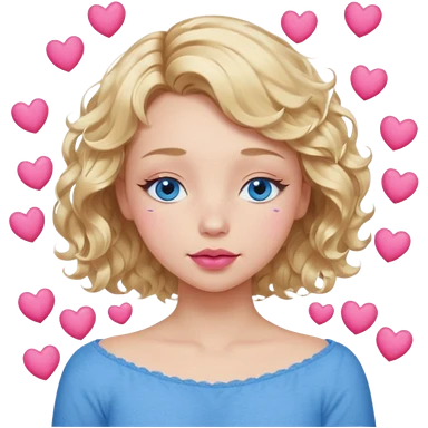 Girl Blonde short wavy hair, blue eyes, cute blue top, long lashes, pink lips, sleeping eyes closed, hearts emoji