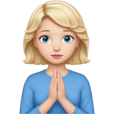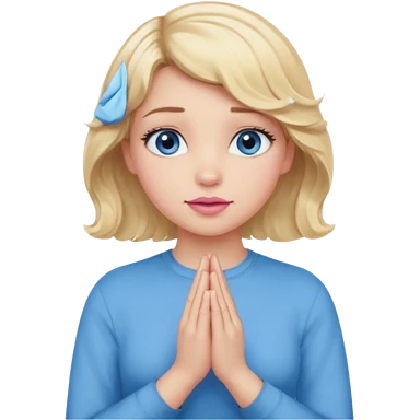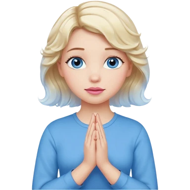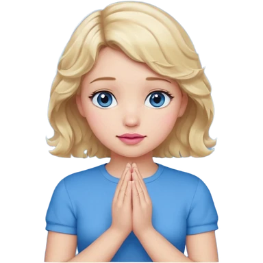 Girl Blonde short wavy hair, blue eyes, cute blue top, long lashes, pink lips, praying hands emoji
