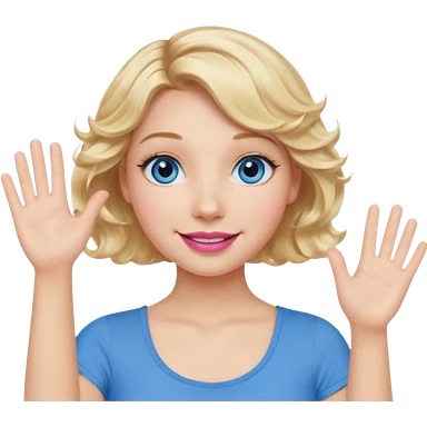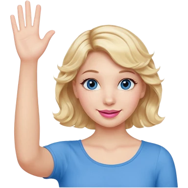 Girl Blonde short wavy hair, blue eyes, cute blue top, long lashes, pink lips, waving hello emoji