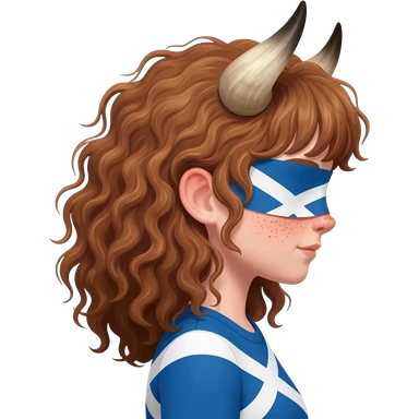 curly girl with freckles with messy light brown bangs covering the eyes with bull horns and bull ears with scottish flag on his shoulders side view emoji