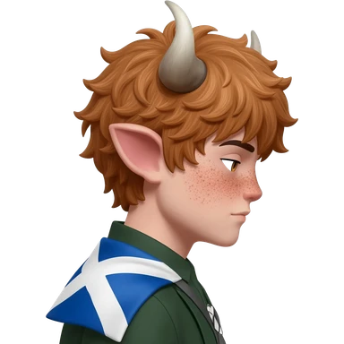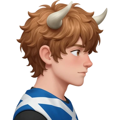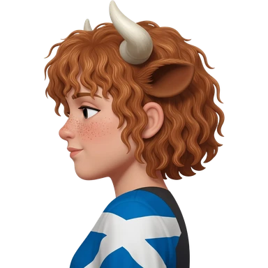 curly femboy with freckles with messy light brown bangs covering the eyes with bull horns and bull ears with scottish flag on his shoulders side view emoji