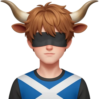curly femboy with messy light brown bangs covering the eyes with bull horns and bull ears with scottish flag on his shoulders emoji