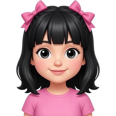 Girl with black hair till her shoulders and also black eyes and wearing two bows on her head and wearing cute pink clothes emoji