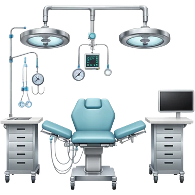 A surgical room setup with overhead lights and sterile instrument table. emoji