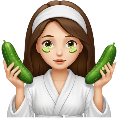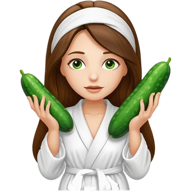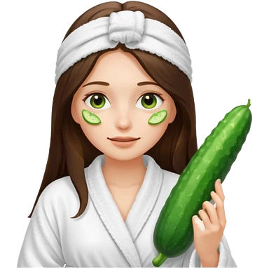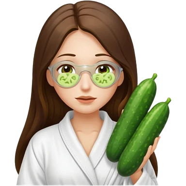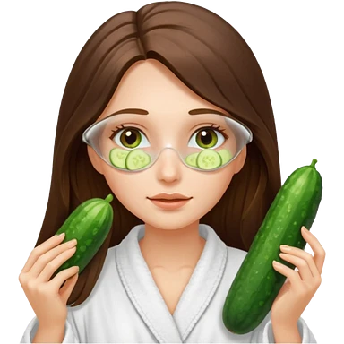 white long brunette hair girl with hazel eyes in a bathrobe with cucumbers covering her eyes emoji