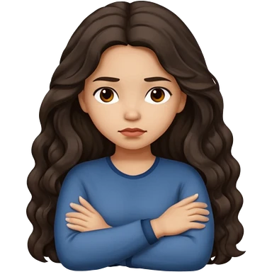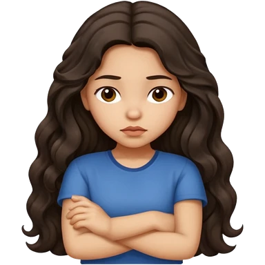 girl dark long wavy hair crossing her arms with slight pout emoji