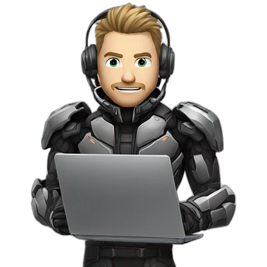 Boy developer behind his laptop with this style : Crytek Crysis Video game with nanosuit hacker themed character emoji