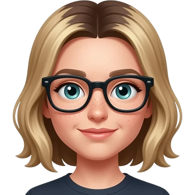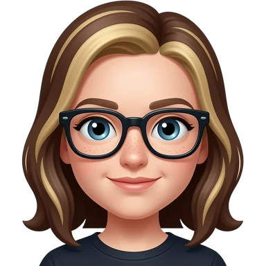 Girl Pointy button nose, aqautic almond eyes, freckled pale skin and dark brown roots with blonde highlights and thick black frame glasses emoji