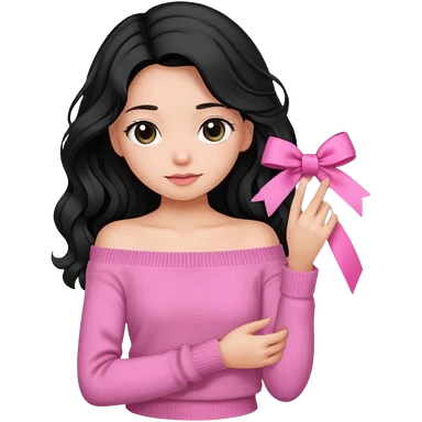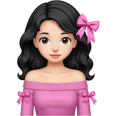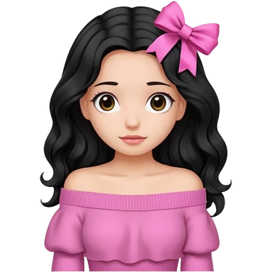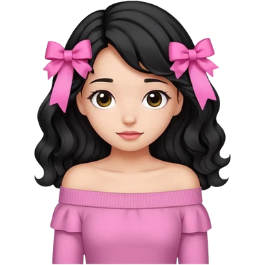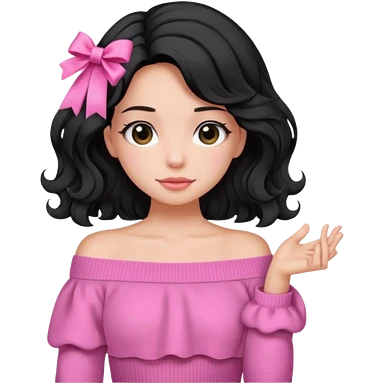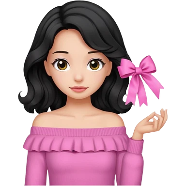 Girl with black wavy little long hair and a ribbon hair clip beside it make it look like wearing a pink off shoulder sweater emoji