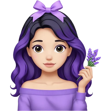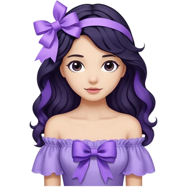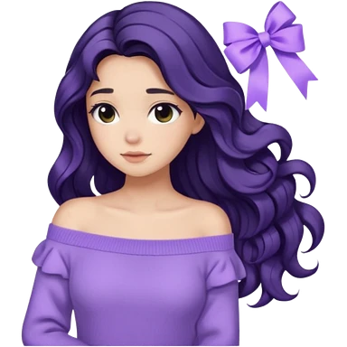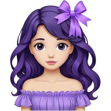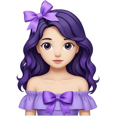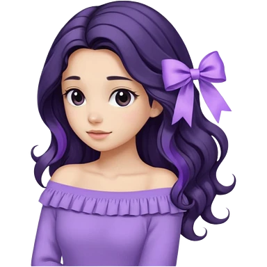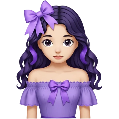Girl with black wavy long hair and a ribbon hair clip beside it make it look like wearing a lavender off shoulder emoji
