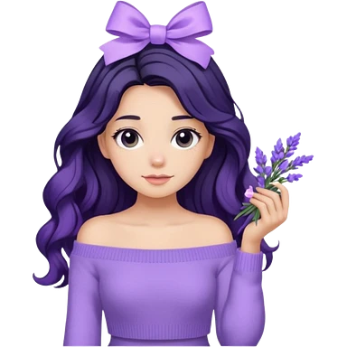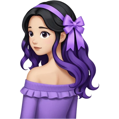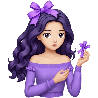 Girl with black wavy long hair and a lavender ribbon hair clip beside it make it look like wearing a lavender off shoulder sweater emoji