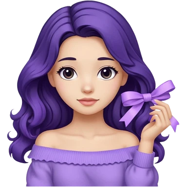 Girl with black wavy long hair and a ribbon hair clip beside it make it look like wearing a lavender off shoulder sweater make its hair stay in the back emoji