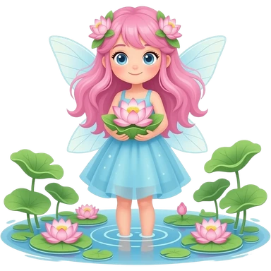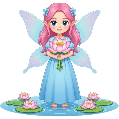 teenage girl fairy, pink hair, long light blue dress, lotus in her hands, she stays in pond emoji