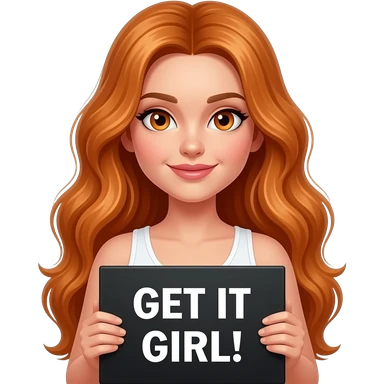 sexy girl with long wavy ginger hair and ginger eyes wearing a white tanktop is holding a black colored sign with GET IT GIRL! written on it emoji