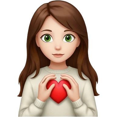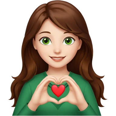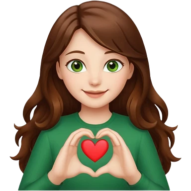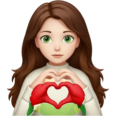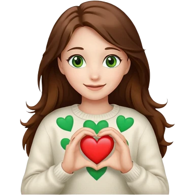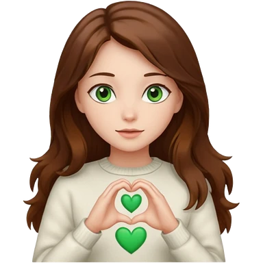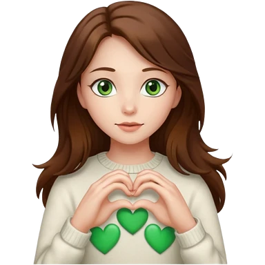 Girl green eyes brown long hair white warm sweater doing hands heart emoji